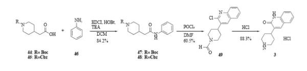 路线二[12]:以2-氯喹林为原料,经3步反应(与哌啶酮反应、取代、脱苄基)得到中间体3(图11)。图11. 中间体3的合成路线二路线三[13]:以哌啶4乙酸衍生物(44或45)和苯胺(46)为起始原料,经3步反应(缩合、环化、水解)得到中间体3(图12)。