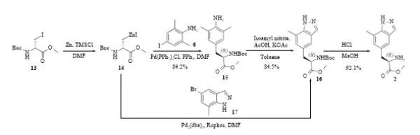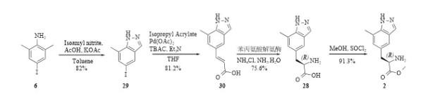 路线一(原研公司专利CN102834388B)[1]:以2,6-二甲基苯胺和N-苄氧羰酰基-L-丝氨酸甲酯为起始原料,分别经碘化和甲烷磺酰化/消除反应得到化合物6和8,然后再经4步反应(Heck偶联、不对称催化氢化、环化、脱Cbz)得到中间体2(图4)。