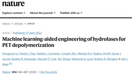 LuH, Diaz DJ, Czarnecki NJ, et al. Machine learning-aided engineering of hydrolases for PET depolymerization. Nature. 2022 Apr;604(7907):662-667. doi:10.1038/s41586-022-04599-z. Epub 2022 Apr 27. PMID: 35478237.
